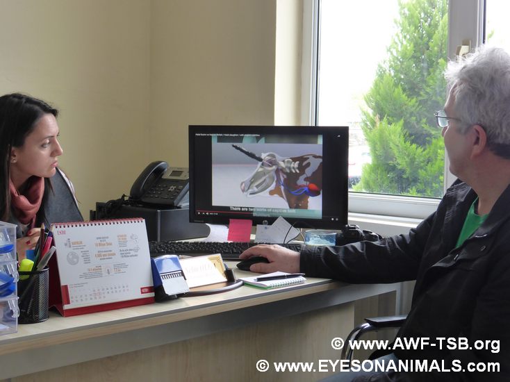 Eyes on Animals and TSB|AWF visited this slaughterhouse and saw a large bovine calmly moved into a restraint box, kept upright on all fours (instead of being forced to fall and then hoisted alive) and be stunned correctly. The bovine fell down unconscious, and was then hoisted and bled out, without any reaction of the animal to the pain. The blood drains out just as easily, if not sometimes more easily as the animal is relaxed when unconscious, than when stressed during live-cutting. This slaughterhouse purchased and installed a pneumatic stunner from Germany 2 months ago in order to offer its customers the choice of first rendering their animals unconscious before the painful procedure of hoisting and live-cutting. We would like to thank Corlu for the meeting today and congratulate them for being a forward-thinking slaughterhouse, willing to take steps to best ensure that animals are caused as little pain or stress during slaughter. This is by far the most humane slaughter process we have seen in Turkey. We would also like to thank Professor Tamer who was the pioneer behind this educated decision.