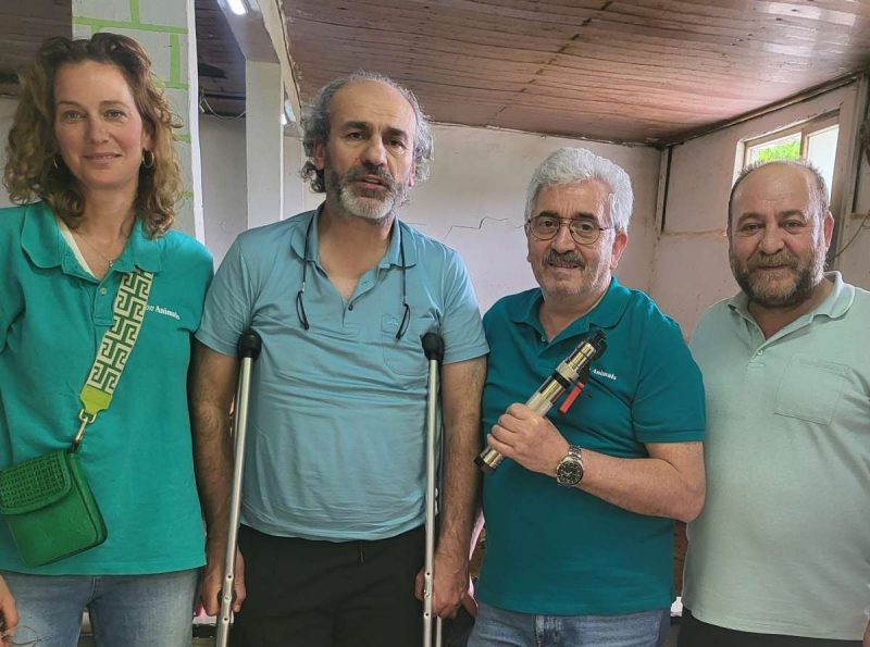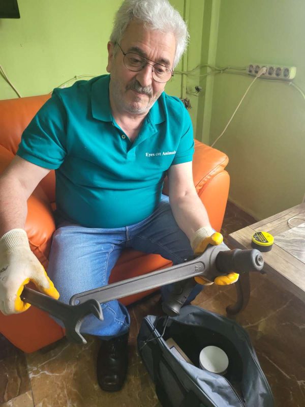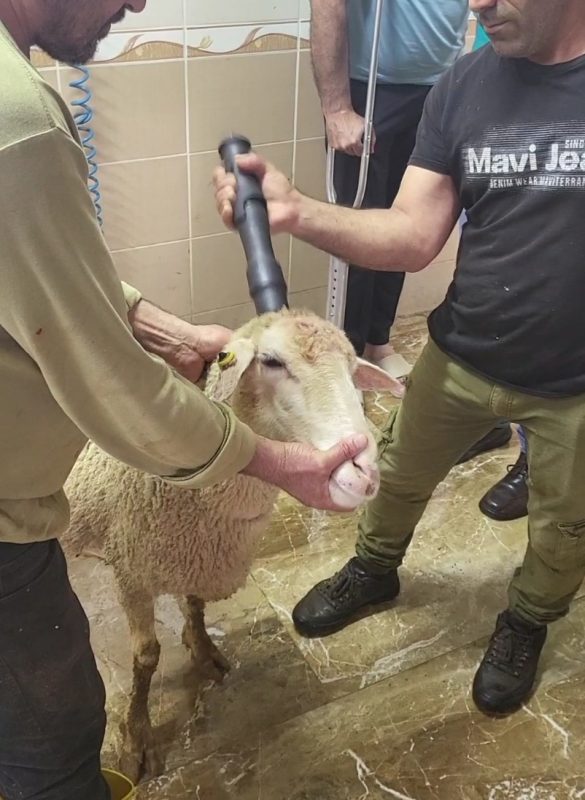 Today Eyes on Animals returned to Emir Adak abattoir, a small abattoir outside of Istanbul that primarily slaughters sheep, and occasionally a bovine. The sheep are housed in a stable inside the slaughterhouse and customers can come, select a sheep and have him or her slaughtered, to take home the meat cuts home later. The manager, and one of his main customers ( a well- known religious writer of books on Islam, Mahmut Elgormus), were very open towards us when we first visited them almost 2 years ago. Back then we had told them about the welfare advantages of stunning the animals before tethering their legs and cutting their throats. We showed them what a captive bolt stunner was, how it worked, and Asalet explained how it is fully in line with Islam. Mahmut was especially enthusiastic. He regularly distributes meat to the very poor, but also cares very deeply for animals. He is now one of the most outspoken person with religious authority supporting the use of stunners.