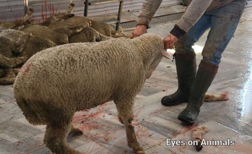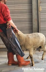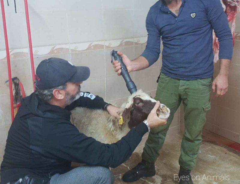 Sadly many farmers and cattle traders still believe in the myth that rendering animals unconscious first is not Halal and thus many refrain from accepting stunning. The sheep are never stunned first. The sheep were handled quite roughly – pulled by their horns and legs, flipped onto their backs, and had their throats cut open while fully conscious. It was clear that the sheep were frightened to death. We helped move the sheep in a more humane way (upright and not dragged by a leg or horns) and felt their heartbeat racing. Although it was very bad, it was still better than at most other Turkish slaughterhouses where sheep are hoisted fully off the floor by one leg and left hanging for 10 to 40 seconds before having their throat cut. Nevertheless what we saw today is not acceptable. We are encouraging that they stun sheep too before slaughter, like is done at a small sheep slaughterhouse in Istanbul.