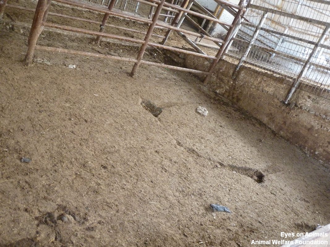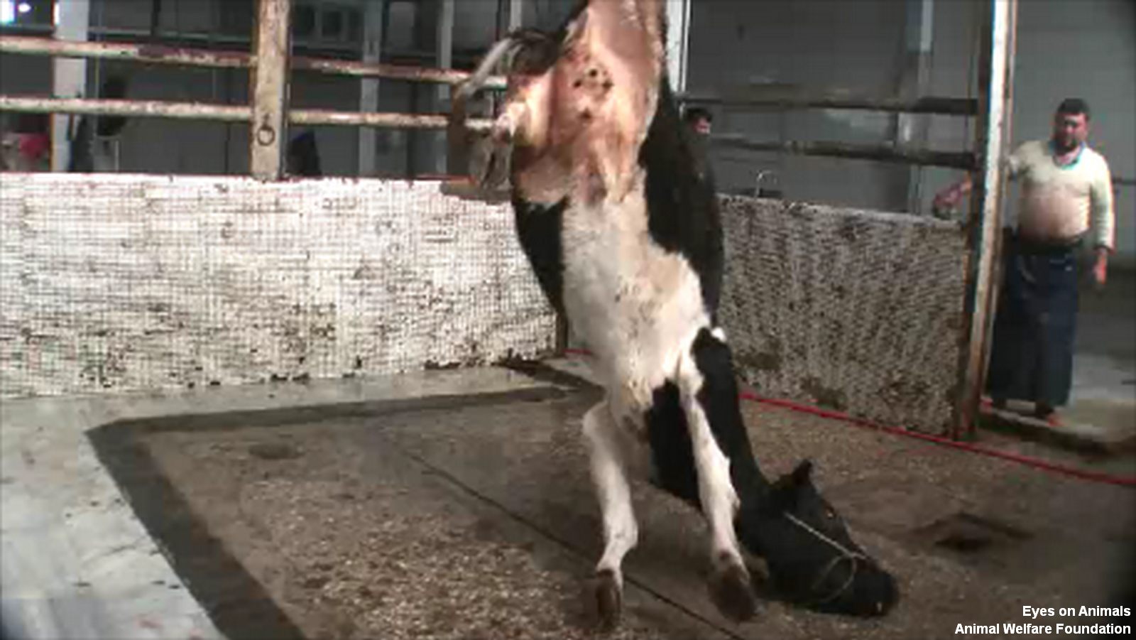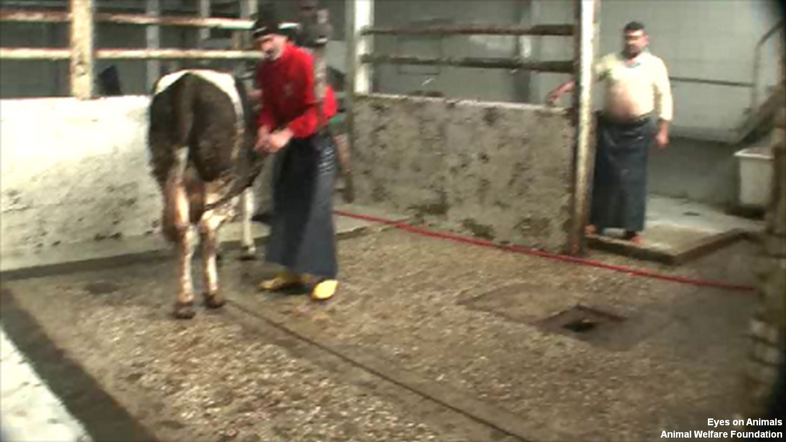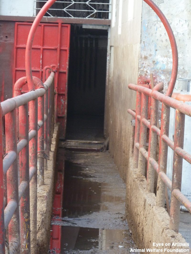 The slaughter area is just an open room with a concrete floor where cattle are brought into, one at a time, to have a chain placed around their hind leg, made to lose their balance and fall hard onto the ground and then be hoisted alive and have their throat cut.
