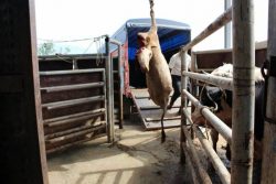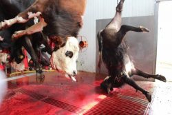 Hala korkunç kaydırma zeminli kabin kullanıyorlar. Son ziyaretimizde en azından hayvanın omuzları yerdeyken kesiliyordu. Ancak bu sefer sığırlar tamamen havaya kaldırılıyor ve hatta bir süre bu halde bırakılıyordu, aynı ilk ziyaretimizde gördüğümüz gibi. Eski sisteme döndükleri için hayal kırıklığına uğradığımızı, bir hayvanı, 450-650 kg. ağırlığının bir bacağına bindirilerek bırakılmasının kabul edilemez olduğunu söyledik. Veteriner hekim, baş kasabın değiştiğini, onun bu yöntemde kestiğini ve onunla bu konuda konuşacağını söyledi. Biz oradayken sakat bir hayvan geldi. Ayağa kalkamıyordu ve acı çekiyor gibi görünüyordu. Boğzı kamyonda kesilmişti ve canı çıktıktan sonra dışarıya sürüklendi. İzlemesi oldukça güçtü ancak yine de en azından boğazı kamyondayken kesildi. Türkiye’de ve Lübnan’da gördüğümüz diğer işletmelerde sakat hayvanlar henüz bilinçleri açıkken sürüklenerek içeriye çekiliyor ve içeride boğazları kesiliyordu.