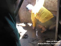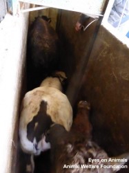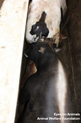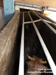 Ayrıca biz oradayken kırık bacaklı bir inekle gelen kamyonu da gözlemledik. Ötenazi uygulanmamış ya da yattığı yerde kesilmemişti. Bunun yerine bacağına zincir geçirilmiş, bu yaralı haliyle kamyondan ön bacağından asılarak “acil” kesim alanına indirilmişti ve kesilmişti.