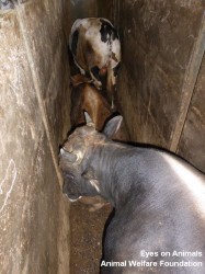 Türkiye’deki ekibimiz bugün zor bir gün geçirdi. Elif Mezbahasına geri döndük. Son ziyaretimizden beri yaptıkları iki önemli geliştirmeye rağmen hayvanlara davranışları halen daha gerçekten kötü. Sığırlar ölümyoluna girmeye bağıran insanlar tarafından zorlanıyor. Birçok sığır dışı yüzünden kayganlaşmış yolda kayıp düşüyor.