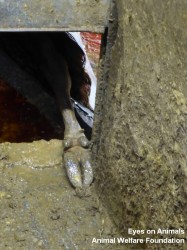 Ziyaretimiz sırasında, başka bir boğanın daha kaygan zeminli zapturapt sistemi yüzünden yaralandığına şahit olduk (Neredeyse Türkiye’deki mezbahaların tümünde kullanılan zapturapt sistemi).