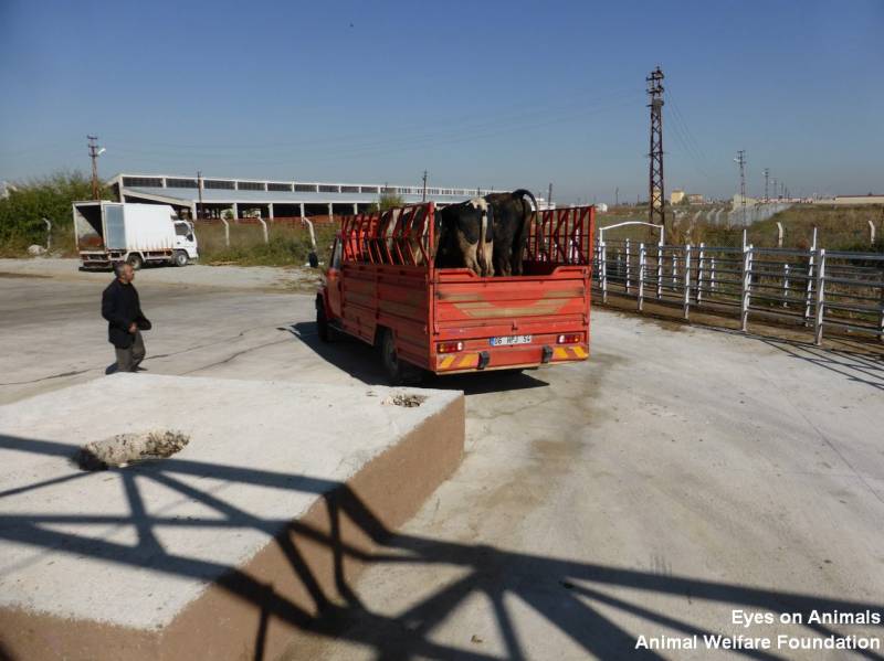 Bu işletmede hayvanlar (diğer işletmelerde gördüğümüz gibi) bacaklarından zincire vurularak tamamen askıya alınmıyorlar. Burada hayvanların başları ve omuzları zeminde kalıyor. Bu kesim şekli tamamen askıya alınarak yapılan kesmden çok daha iyidir. Kasap, tek seferde boğazı kesebilecek kadar uzun ve keskin bir bıçak kullanıyor. Ayrıca hayvanların askıya alınma ve yukarı çekilme süreleri diğer mezbahalara göre çok daha kısa, 18 – 33 saniye arası. Bu süre oldukca iyi. Ancak yine de hızla değiştirilmesi gereken bazı kritik noktalar da var. Bir kamyonet ile iki boğa ve bir inek getirildi. Hayvanlar kamyonet kasasına zincirlenmişti ve sakatlanma riski oldukca yüksekti. Kamyonet hayvan taşımaya özel tasarlanmamıştı. Ayrıca hayvanları güvenle boşaltmak için arkasında rampa kenarları da yoktu.
